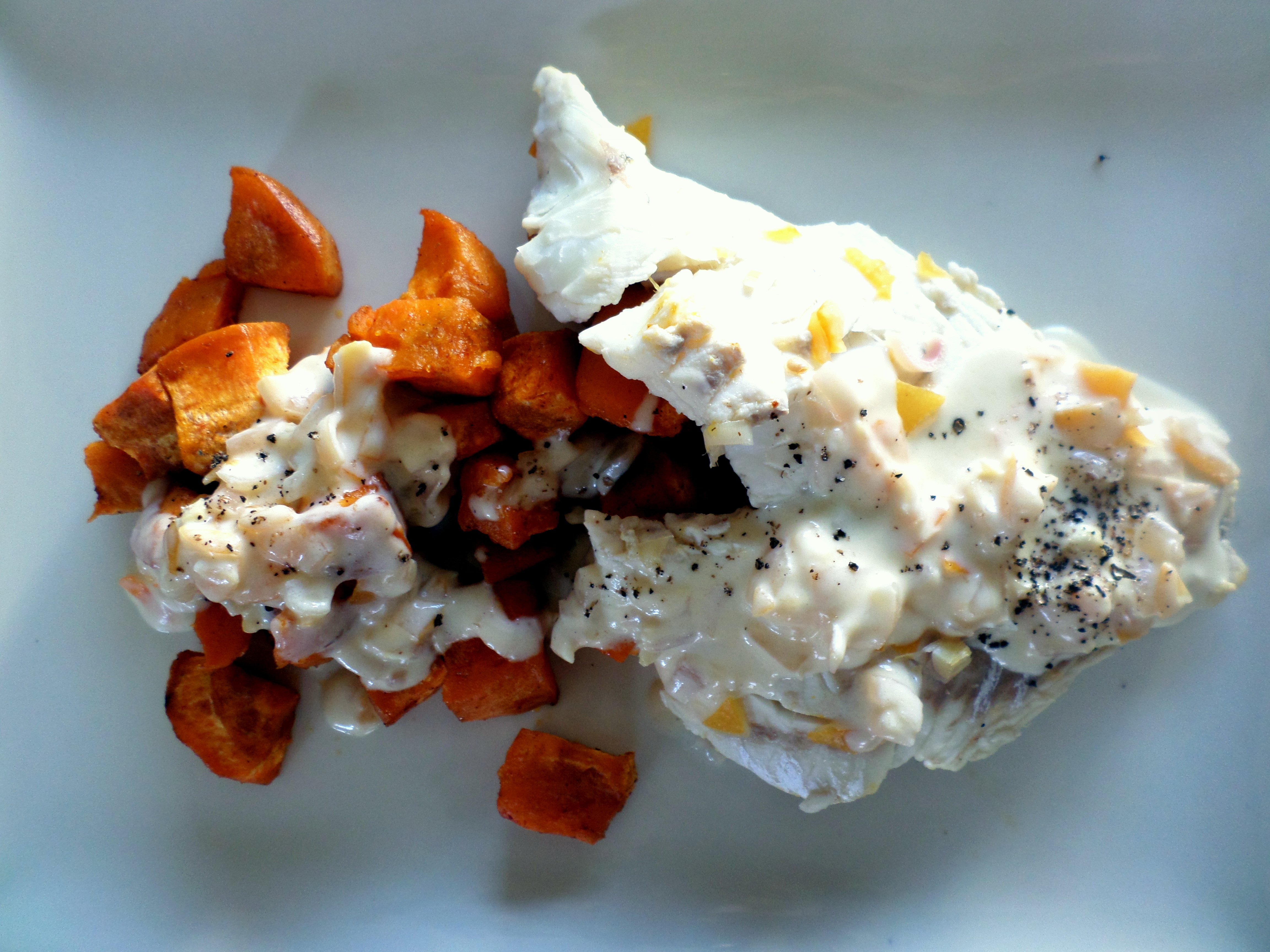 Dans une poêle, faites suer les échalotes dans des l’huile d’olive. Ajoutez ensuite le jus de cuisson des daurades et faites-le réduire jusqu’à ce que le liquide ait presque disparu. Quand le mélange devient sirupeux, retirez la badiane et ajoutez la crème. Remuez bien pour que la sauce garde une belle consistance. Nappez la daurade et les patates douces, poivrez et servez !
