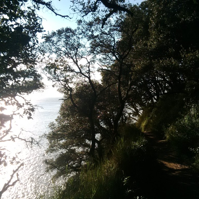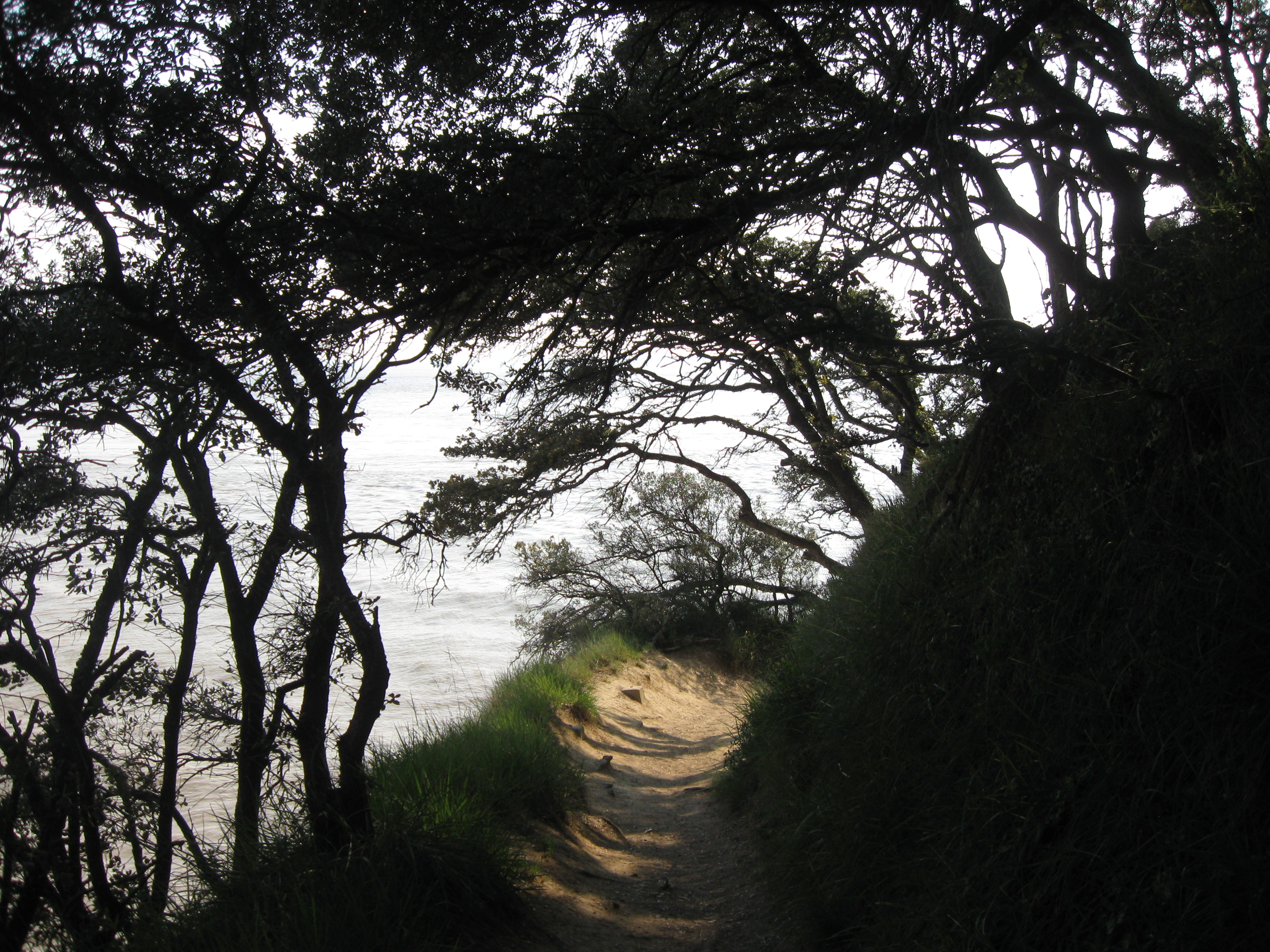 La ballade démarre non loin de la crique de Suzac. Un petit chemin de terre claire (accessible au public depuis trois ou quatre ans seulement) serpente la côte, perché sur les falaises calcaires. On passe sous les arbousiers et différentes espèces de chênes, qui créent des jeux de lumière sur le chemin et nous laissent parfois seulement deviner l’estuaire en contrebas.