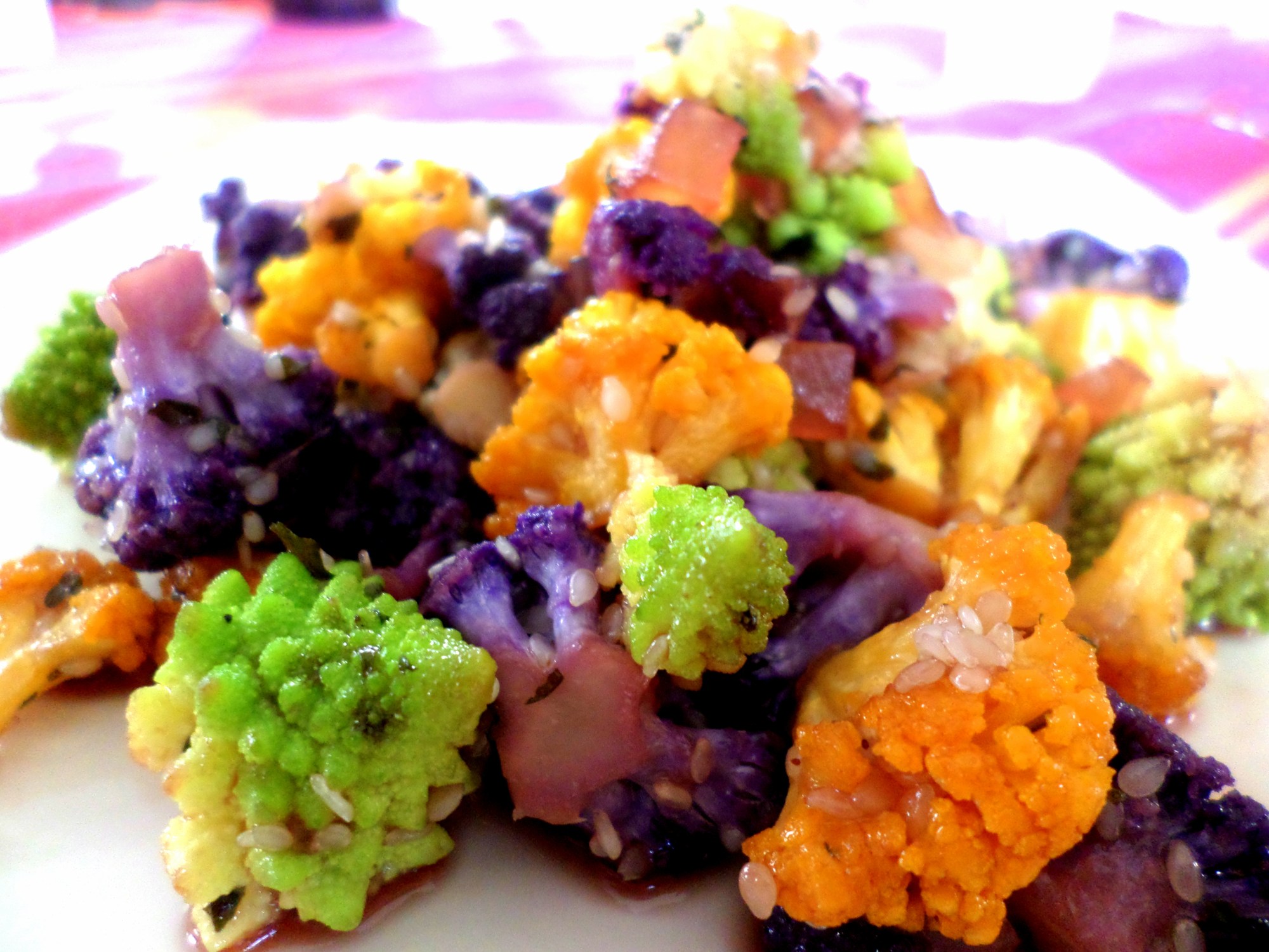 Sur les étals du marché et de la biocoop fleurissent en ce moment des choux-fleurs plus beaux les uns que les autres : blanc, vert, violet, orange… Alors bien sûr, je craque, et voilà mon réfrégirateur rempli de trois choux différents, alors que je ne suis pas particulièrement fan de cet aliment. Ne voulant pas laisser dépérir ces pauvres légumes, j’ai donc dû improviser une petite recette, aussi savoureuse qu’esthétique, aux accents asiatiques.