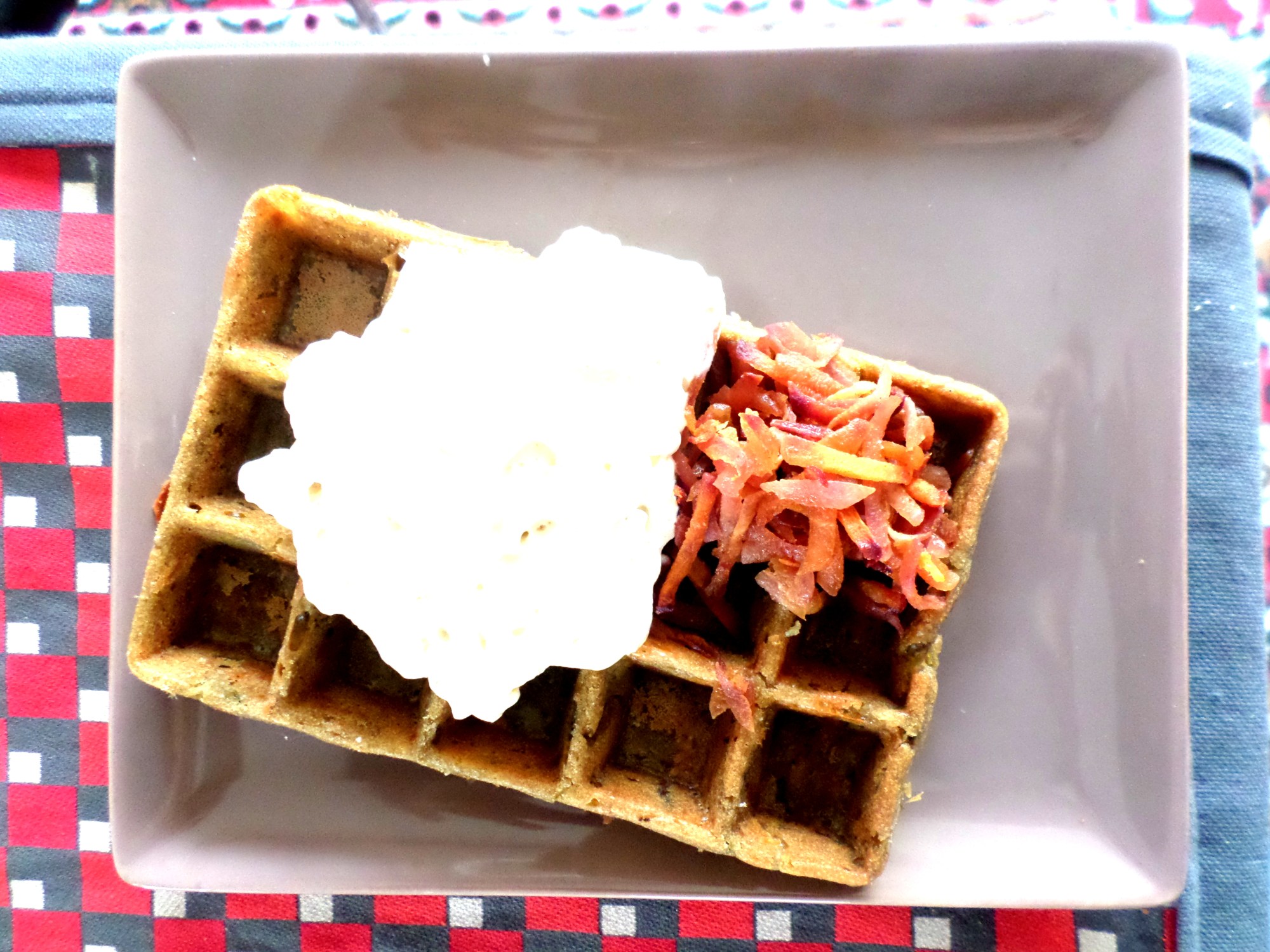 Mais pas des gaufres de base, non, non, non ! J’ai une réputation à tenir tout de même ! J’aurais pu, il est vrai, utiliser mes magnifiques carottes multicolores pour réaliser un autre plat, mais non, tant pis pour l’esthétique, ce midi, c’est gaufres !