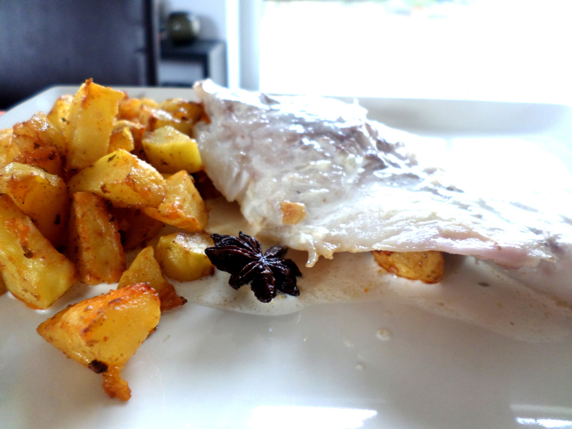 Coupez vos pommes de terre en petits morceaux et déposez-les dans une boîte hermétique. Ajoutez la marinade du poisson (une fois que celui-ci a bien mariné), une demi cuiller à café de paprika, fermez la boîte et secouez-la énergiquement, de manière à ce que la marinade se répartisse bien. Versez ensuite son contenu dans un plat et enfournez à 200° pendant environ 40 minutes : 20 minutes à couvert, puis sans couvercle, en remuant de temps en temps.