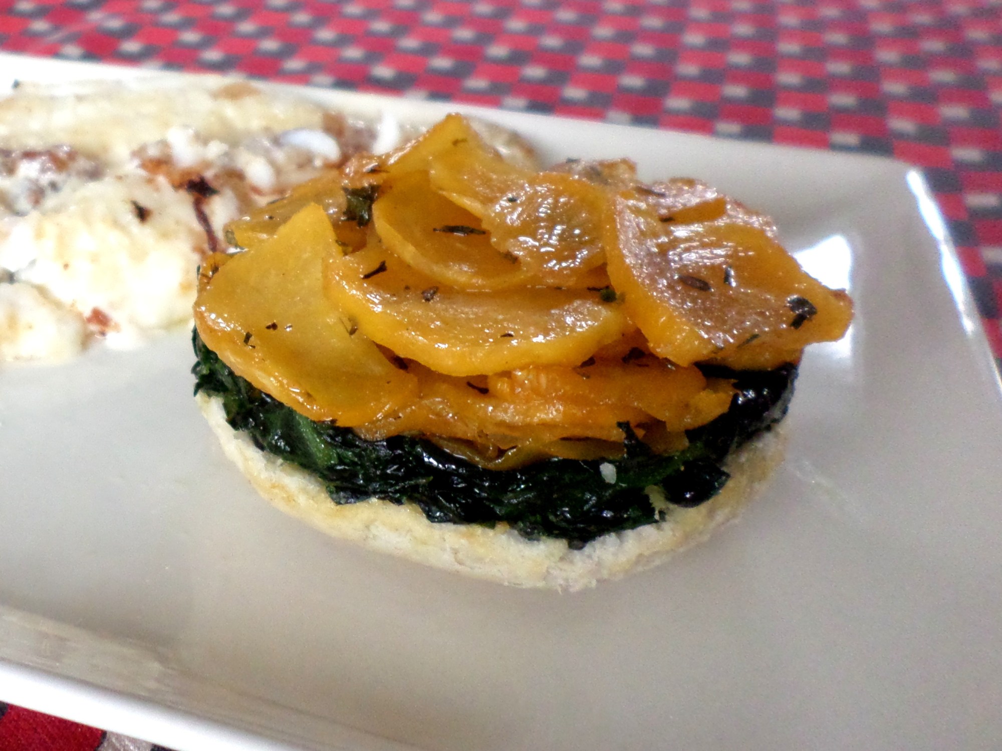 Dans de petits ramequins huilés, disposez, au fond et bien tassés, les lamelles de navet. Superposez les épinards, puis fermez le tout avec une rondelle de pâte feuilletée, dont vous rentrerez les bords dans le ramequin.