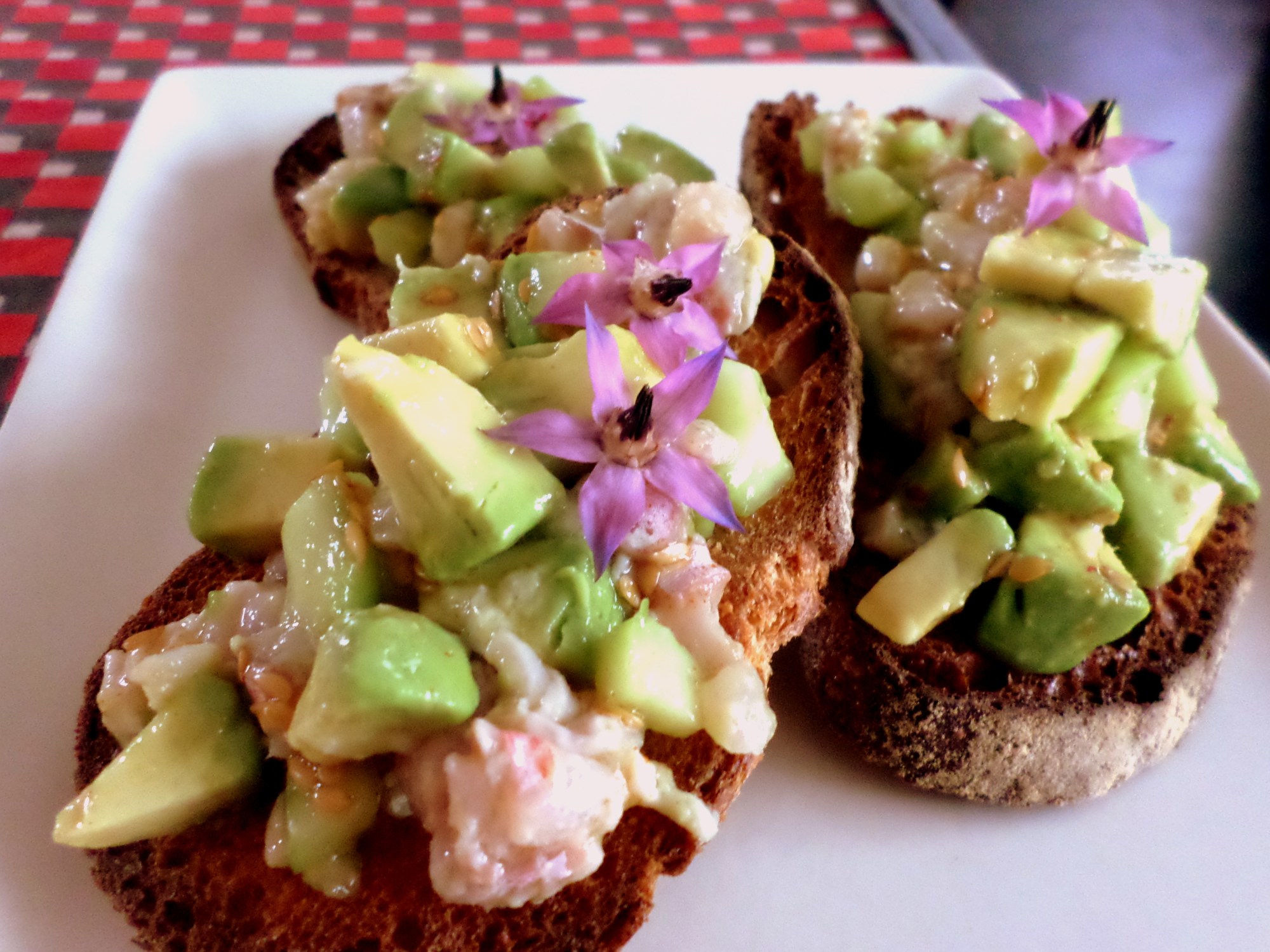 Dans un four préchauffé à 250, faites dorer vos tranches de pain de campagne avec un peu d’huile d’olive au yuzu. Une fois les tartines grillées, déposez la marinade dessus et surmontez le tout de quelques fleurs de bourrache.