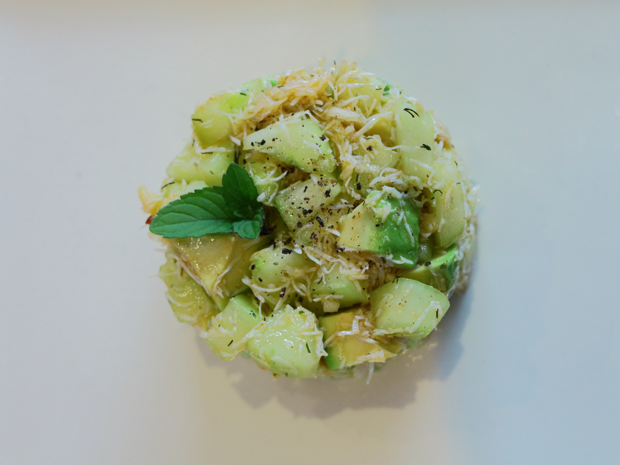 Hachez l’échalote, ciselez l’aneth et la menthe, ajoutez ensuite dans un bol l’huile et le vinaigre, afin de réaliser une vinaigrette. Coupez les concombres en enlevant les graines, coupez également l’avocat en gros morceaux. Mélangez le tout à la chair de tourteau, et cerclez. Surmontez le tout de quelques feuilles de menthe.