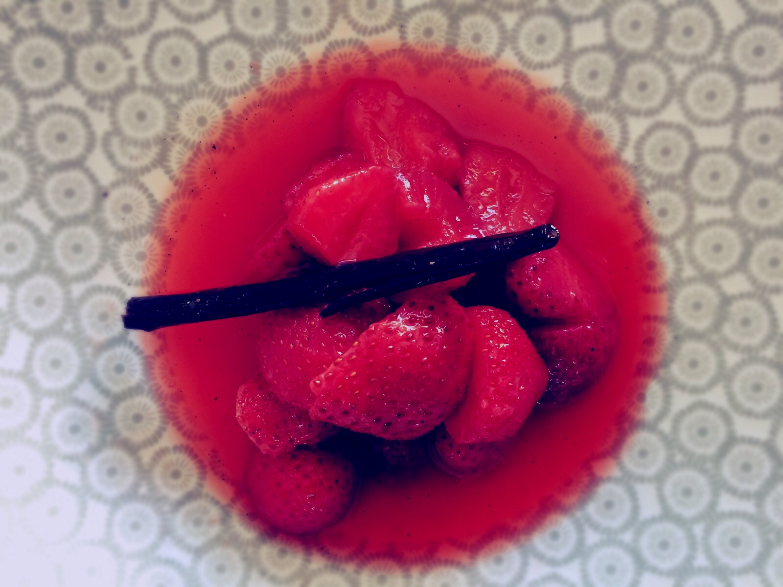 Dans une petite casserole, faites bouillir l’équivalent d’une tasse d’eau avec les feuilles de verveine, le miel, le jus du demi citron, et la gousse de vanille incisée dans la longueur. Quand le liquide arrive à ébullition, éteignez le feu et laissez tiédir. Filtrez le mélange et versez-le sur les fraises en conservant les gousses de vanille. Laisser infuser le tout au moins une heure au frigo.