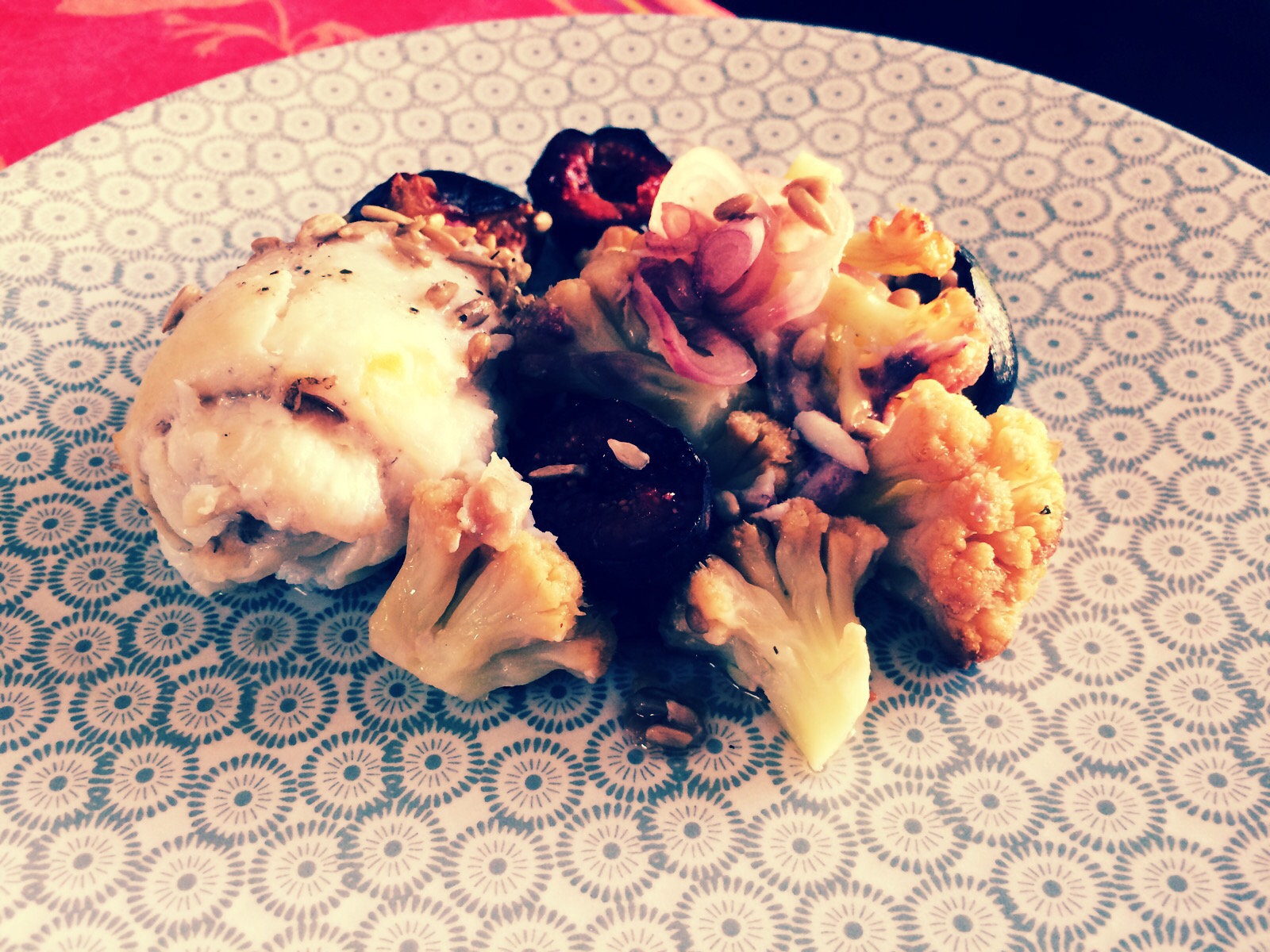 Parmi mes fruits préférés, la figue figure en bonne place. Mais voilà, je n’ai que très peu de goût pour les desserts, si bien que je n’en fais presque jamais. Alors, il a fallu trouver un plan B pour utiliser mes chouchoutes. Elles se marieraient certes à merveille avec du canard, mais la viande étant également bannie de mon régime alimentaire, j’ai voulu essayer de l’associer au poisson, et la tentative est plutôt une réussite. Seul bémol : pour accompagner ce petit duo, j’avais préparé du chou-fleur. Je trouve l’association peu heureuse, car il s’accorde très mal avec la figue. Je vous conseille donc d’accompagner le tout par de petites pommes de terre dorées au four.