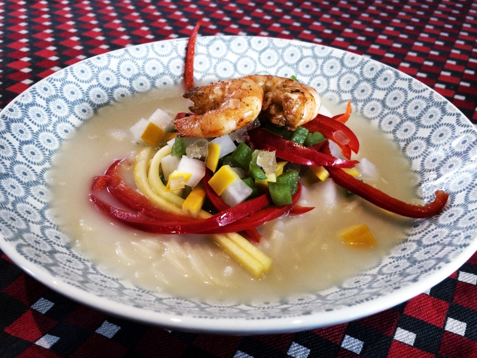 Dans des assiettes creuses, versez une bonne louche de bouillon aux vermicelles. Déposez ensuite en premier les crevettes en morceaux. Ajoutez par dessus la brunoise/julienne de légumes et surplombez le tout par les deux crevettes entières. Vous pouvez également ajoutez quelques pluches de coriandre.