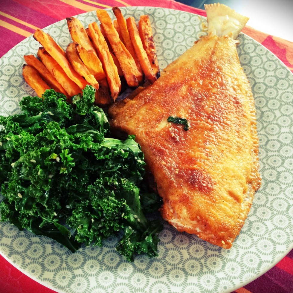 Cardine meunière au paprika, frites de patate douce, kale sauté à l’huile de coco et au sésame