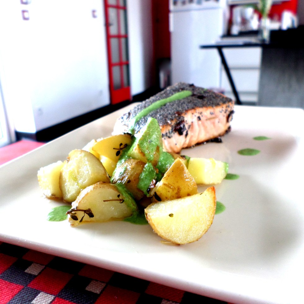Pavé de saumon et sa croute de pavot, pommes de terre nouvelles à l’huile de noisette toastée et sa sauce à la mâche